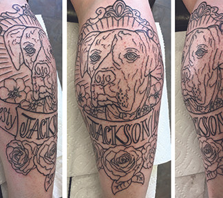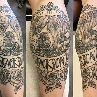 Ben is one of my most loyal clients, and has been working with me for years on his tattoos. Last year his beloved dog Jackson died; Ben wanted to commemorate and remember him with a calf tattoo. He decided to use the Traditional American or Old School style of tattoo, as I draw them. Now Ben can look down the back of his leg and see Jackson's face looking back at him. He wrote this moving eulogy to Jackson and is allowing me to share it: “I picked you up at Petco in Baton Rouge. I was 22. You were 8 weeks. I filled the shopping cart with too many dog toys and treats. You were with me during my last few days at LSU. We moved into our first house together. You were incredibly protective and wouldn’t leave the yard even if I left the gate open. You taught foster puppies how to be dogs and they loved you. We rode across the country together to Portland. You were the easiest apartment dog ever. Jessica [Ben's wife] immediately fell in love with you. Abbie learned from you; she is an incredible dog because of it and you had an amazing amount of patience with the littles. You collapsed last week and I knew the end was near. This morning you collapsed for the last time. We were all here when it happened and I hope we were able to bring you some comfort during your last moments. I will never forget you and what we went through together. I promise. I’ll miss you.”