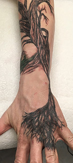 When he contacted me for a cover up tattoo project, Tommy had a lovely idea for what imagery to use; he had an old ring tattoo and some scars on his left forearm, and he thought we could use a tree growing up his hand, turning into a forest/wood, complete with a deer in the background. He says, "For some time I’ve wanted to cover my past scars and marriage up with my new life but didn’t know how or with what, exactly. I knew I wanted a nature scene to go with my new life and new hobbies but I couldn’t find the image I had in my head on the web so I decided the best thing to do was find the right cover up artist.