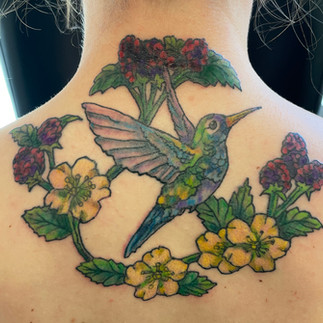 This placement, centered at the high back of my neck and top of my shoulders looks fantastic, and the fact that she pulled it all together in just a consult and two sessions is wildly cool to me. Victoria is truly a queen of her craft and I feel so lucky to be wearing her art! This one’s staying with me for life, and I couldn’t be more proud to show it off. I’m absolutely in love with this gorgeous hummingbird with florals and so grateful for the time, care, and attention Victoria puts into her work! It really came to life and I’m beyond happy with it!"