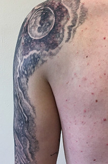 Driving in from out of state, Jacob came in to see me about some old tattoos he had on his chest and left arm. He says, "The idea for my project started small. I wanted a cover-up to give me a unified theme instead of a patchwork jumble. I wanted a better representation of my person, on my person. I wanted to heighten the artistic quality and add some elements that mattered more to me. "After a multitude of failed attempts at finding an artist willing to undertake my project in the way I was hoping, I found the right person when I found Victoria. A concept meeting, wherein my idea was expertly interpreted, produced a serendipitous result that checked every box and then some. I couldn't be more pleased with how everything came together. "What I refer to as my 'Mars Attacks!' piece embodies my love for Golden Age Sci-Fi. It captures the classic look of the pulp-y cover art of those ten cent novels, and evokes a fantastical sense of otherworldly drama. The tattoo kind of surprised me with how well it captures what I love about Sci-Fi; all those What-If's and the doomsayer warnings of the Hubris of Mankind in the far off year 2000. Silly to us now, sure, but nobody knew for certain what would happen in the future. For example, I didn't know that like the people of yester-year, one day I too would be the subject of a Martian Invasion."