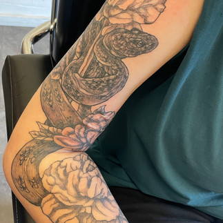 The snake will stay gray and the peonies, which will do the main job of camouflaging the scars, will be in color, which will make the blossoms pop off their arm.
